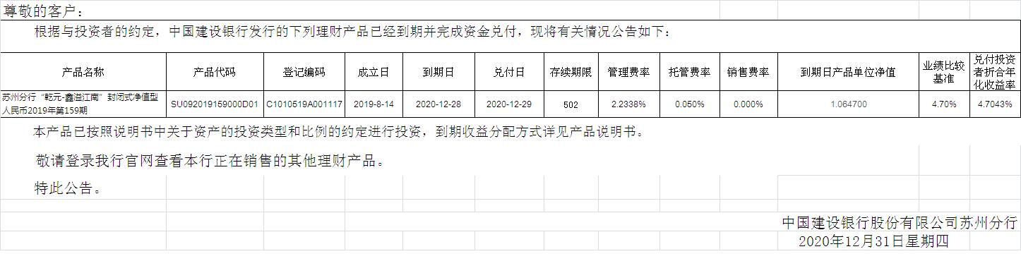 中国建设银行理财产品终止及清算公告