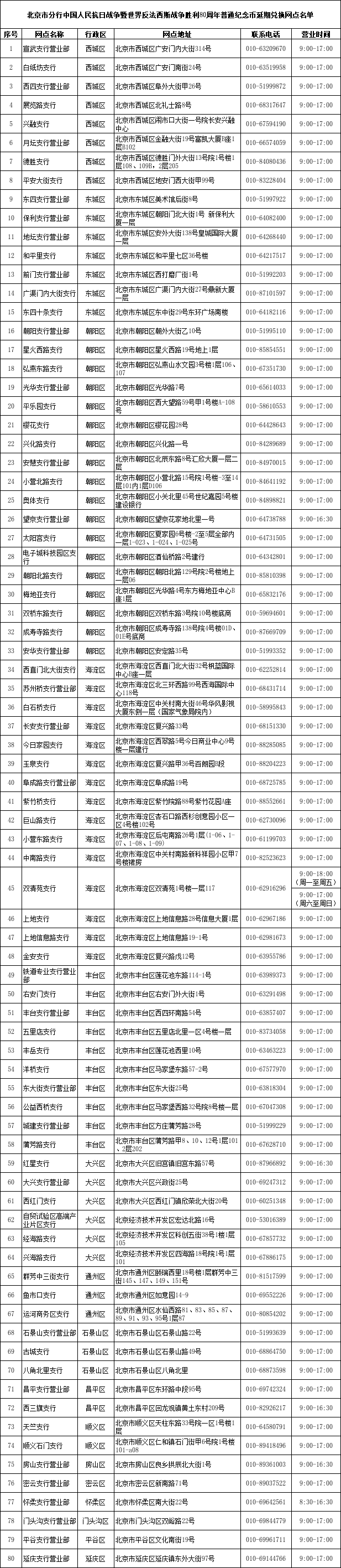 为进一步做好中国人民抗日战争暨世界反法西斯战争胜利80周年普通纪念币(以下简称抗战胜利80周年币”)发行工作,本着“金融为民”的原则,经中国人民银行北京市分行批现就抗战胜利80周年币延期兑换事宜公告如下: